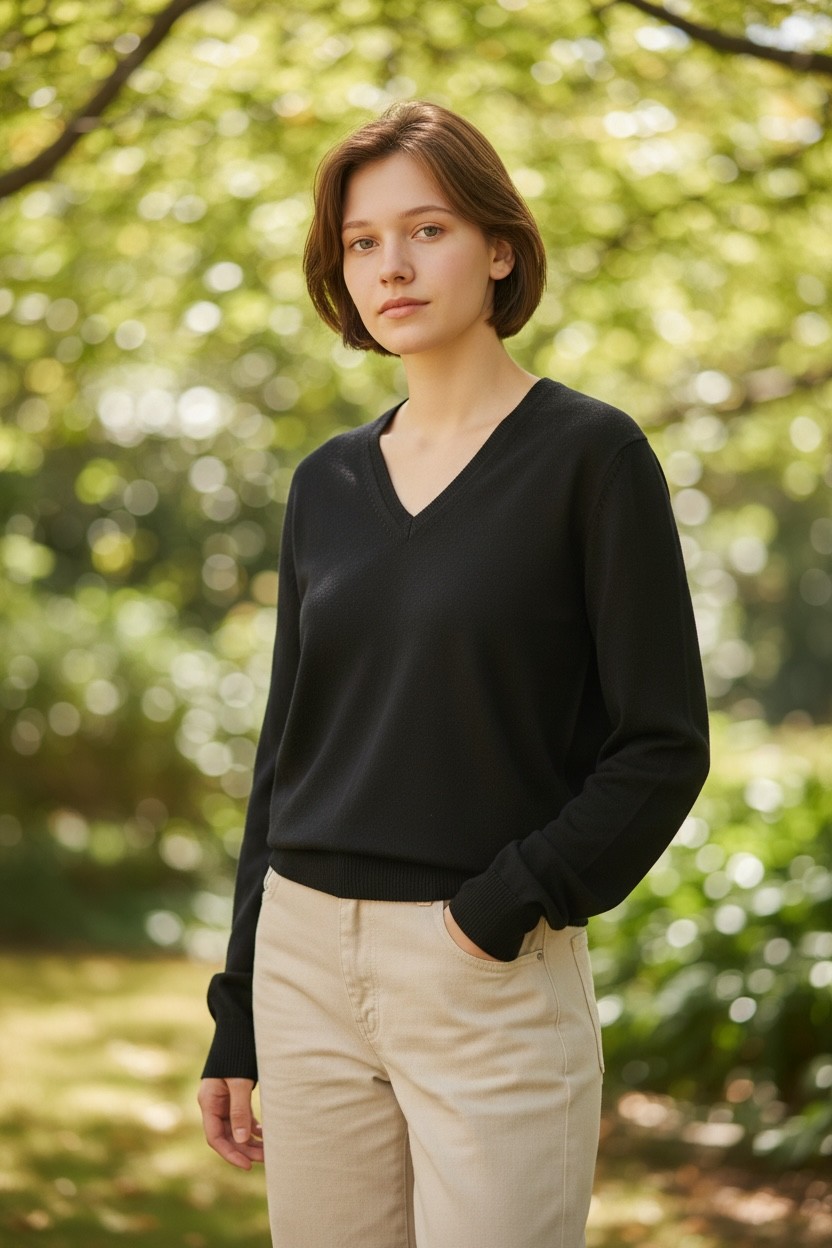 開きすぎない上品なラインで、顔まわりをすっきりと見せ、抜け感のある印象をつくります。シンプルながら、性別を問わず心地よく着られるシルエットに仕上げています。